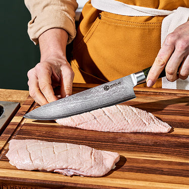 Combining 67 layers of Japanese Damascus steel with German engineering principles, we’ve developed a knife with a weighted steel bolster and a precise, nimble Japanese blade.